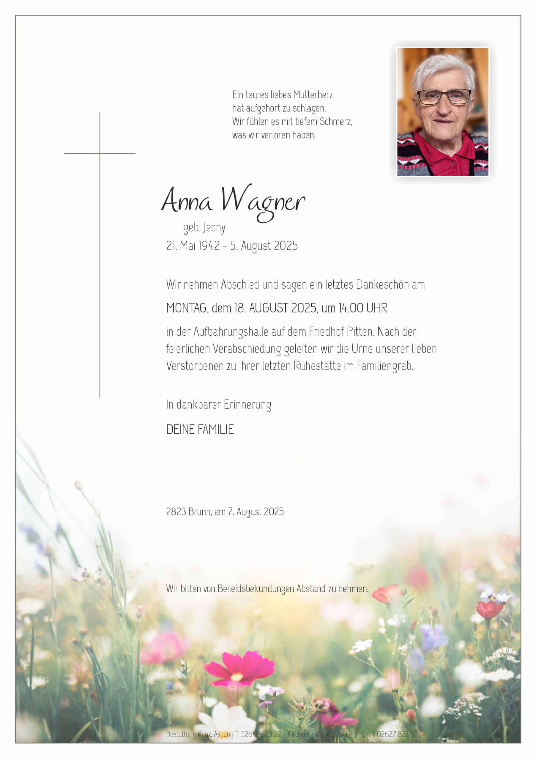 Unser herzliches Beileid und aufrichtige Anteilnahme entbietet Fam.Anna Seiser!